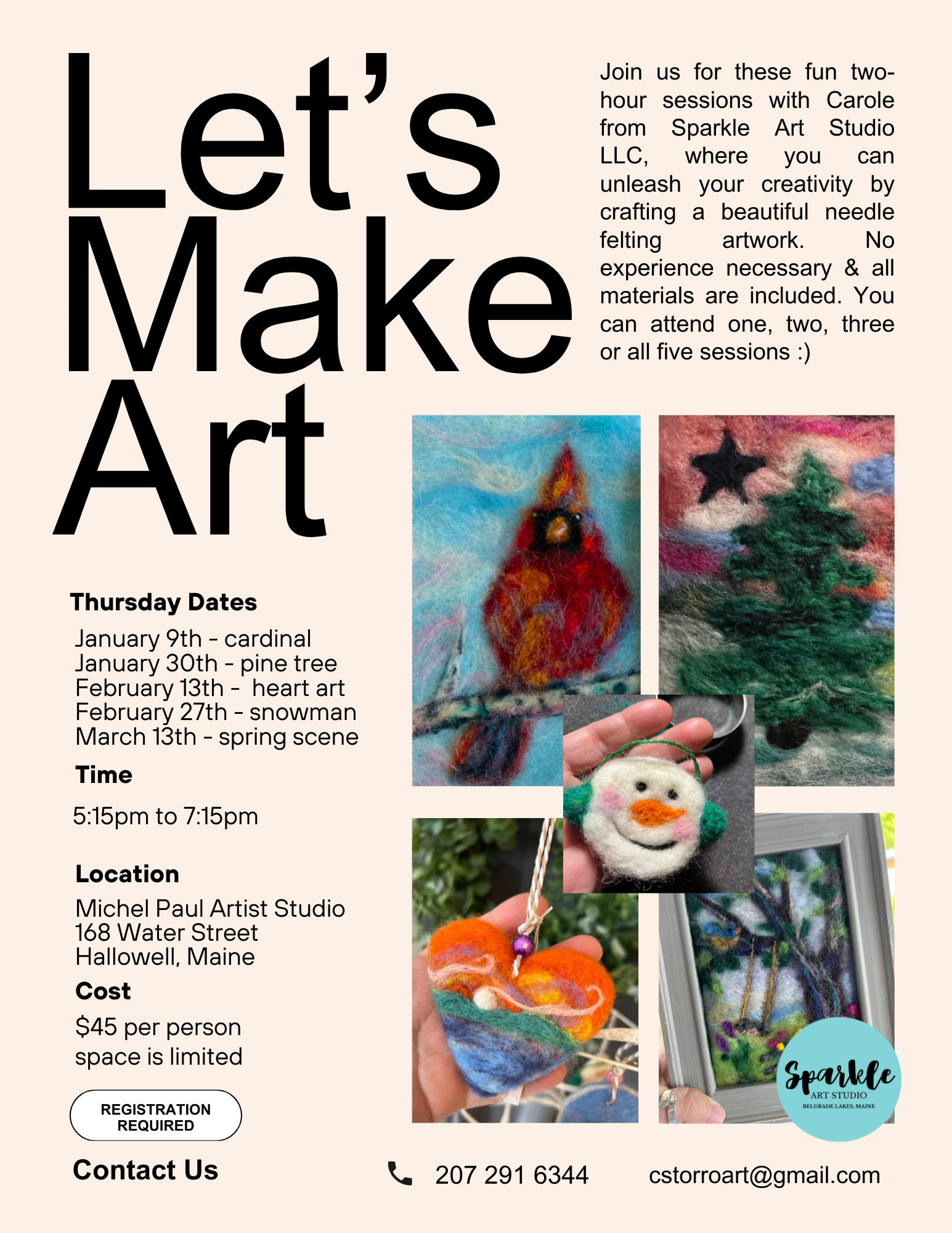 Felting Class with Carole Storro Thursday, January 30, 2025 5:15 PM 7:15 PM Michel Paul Artist Studio 168 Water Street Hallowell, ME United States (map) Google Calendar ICS