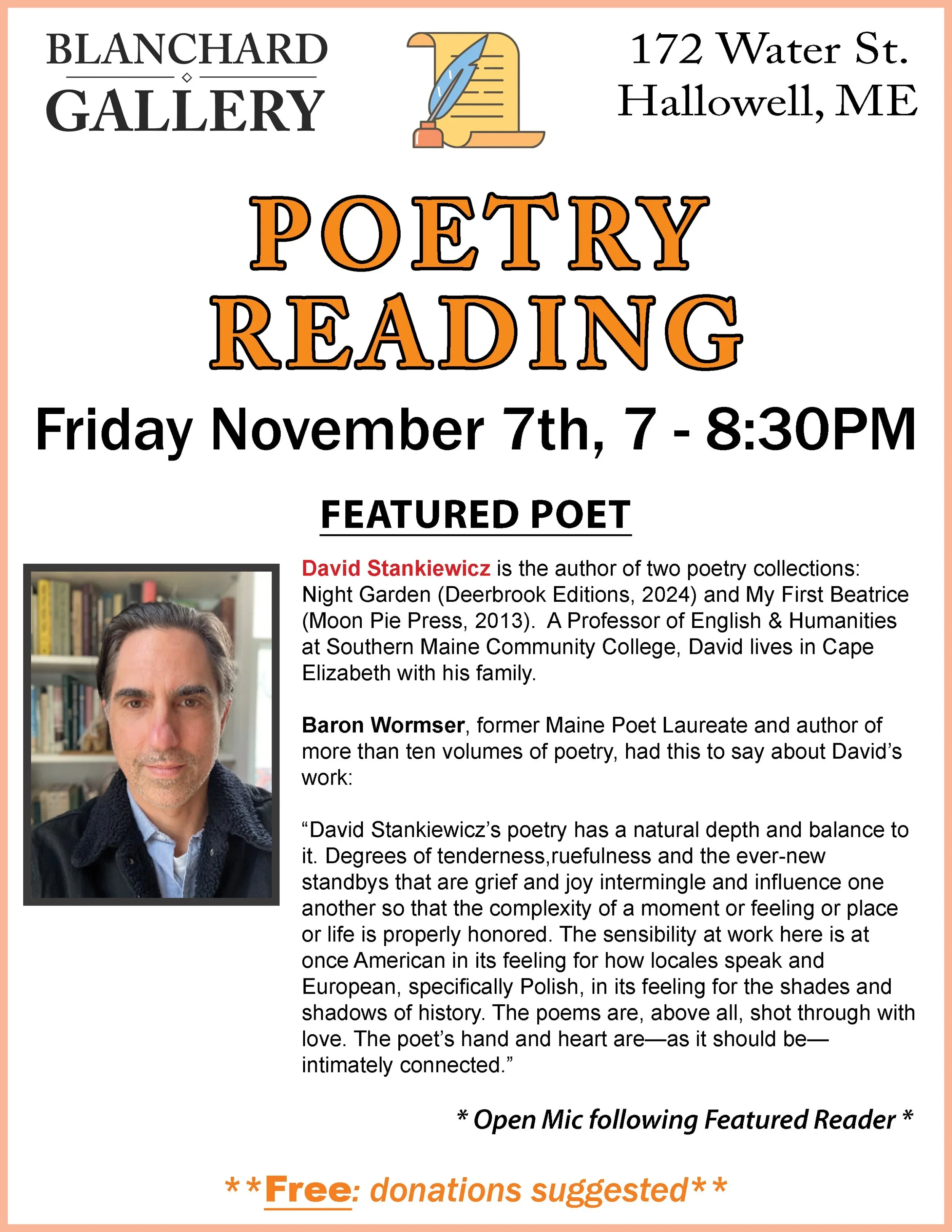 Back to All Events Poetry Reading at The Blanchard Gallery Friday, November 7, 2025 7:00 PM 8:30 PM The Blanchard Gallery 172 Water Street, Hallowell, (map) Google Calendar ICS The latest posts fromThe Blanchard Gallery The Blanchard Gallery
